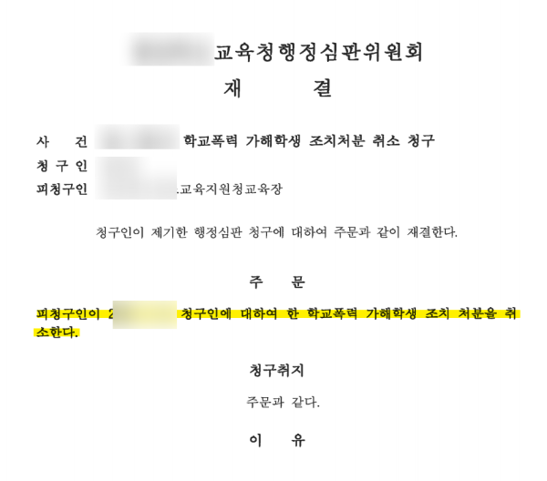 ▶ 심판결과 : "피청구인이 20XX. X. X. 청구인에 대하여 한 학교폭력 가해학생 조치 처분을 취소한다"