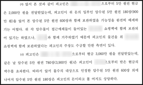 2심은 하나은행 띠지로 묶여져 있는 5만 원권 600장(3,000만 원)은, 당시 다른 공동피고인이 하나은행 계좌에서 3,060만 원 중 일부라고 판단하였고, 나머지 180장(900만 원)에 대하는 아래와 같은 이유로 몰수의 대상이 아니라고 판단하였습니다(일부 결과에 아쉬움이 있지만 선고형에서 좋은 결과가 나왔기에 최선을 다한 결과라고 생각합니다).