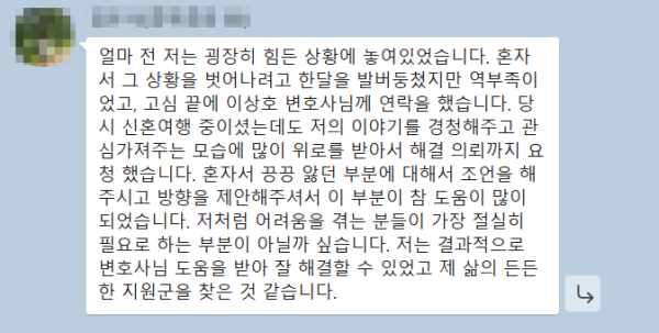 저는 결과적으로 변호사님 도움을 받아 잘 해결할 수 있었고