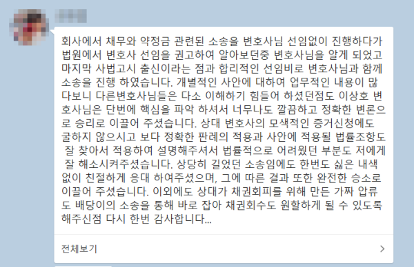 이상호 변호사님은 단번에 핵심을 파악 하셔서 너무나도 깔끔하고 정확한 변론으로 승리로 이끌어 주셨습니다.
