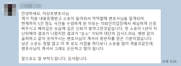 매번 같이 슬퍼하고 같이 웃어주시는 변호사님이 계셔서 동반자를 얻은 기분이였습니다.