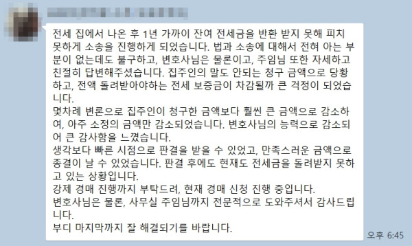 변호사님은 물론, 사무실 주임님까지 전문적으로 도와주셔서 감사드립니다.